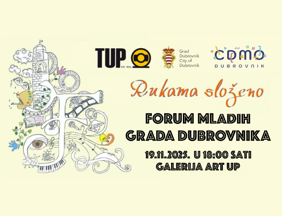 Druga aktivnost iz cjelogodišnje manifestacije Forum mladih Grada Dubrovnika pod nazivom “Rukama složeno” održat će se 19. studenog s početkom u 18 sati u galeriji Art Up uz potporu TUP d.d., Lokacija je galerija u dvorištu upravne zgrade TUP-a koja posljednjih mjeseci postaje susret kulture i umjetnosti!